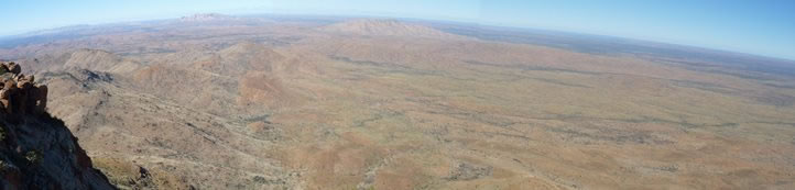 A three-shot panoramic view looking south-east and south from the summit of Mt Zeil. The steep lichen-covered cliffs that form the south face of Mt Zeil are visible on the left-hand edge of the picture. The hump on the horizon about thirty percent the way in from the left is Mt Sonder, while Mt Razorback is near the top of the centre of the photograph. (I should perhaps add the you can’t really see the curvature of the earth from the summit of Mt Zeil – it’s just the way in which my “photostitch” programme has joined the three photos that I’ve melded into one.) |