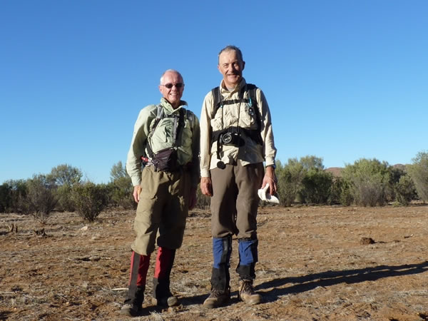 Back at our campsite, I took this timed-exposure of the two of us standing in the same spot where ten-and-a-quarter hours earlier I’d taken a picture of us in the pre-dawn light prior to the start of the climb. Our ascent of Mt Zeil took us five hours; we spent 50 minutes on the summit; and the descent we’d just completed had taken us a little less than four hours and twenty-five minutes. We were pleased with our times, and equally pleased to be back at our campsite before sunset. |