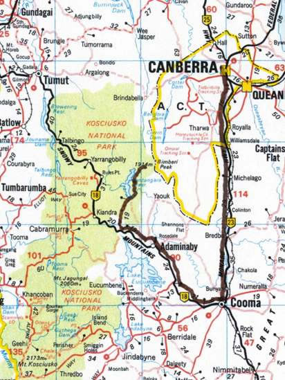 In the early evening, we I returned to the airport to collect the hire car that Eric and I had booked, and at 6:10 pm Eric and I left Canberra. Mt Bimberi is on the western edge of the Australian Capital Territory, and – as a result – in order to get within striking distance of the mountain, we first headed due south to Cooma and then drove north-west to Adaminaby. |
