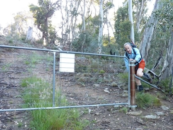 At 7:12 am (after almost an hour-and-three-quarters' hiking), we climbed this fence and crossed over into the Australian Capital Territory (ACT). We also left the Kosciuszko National Park and entered the Namadgi National Park.