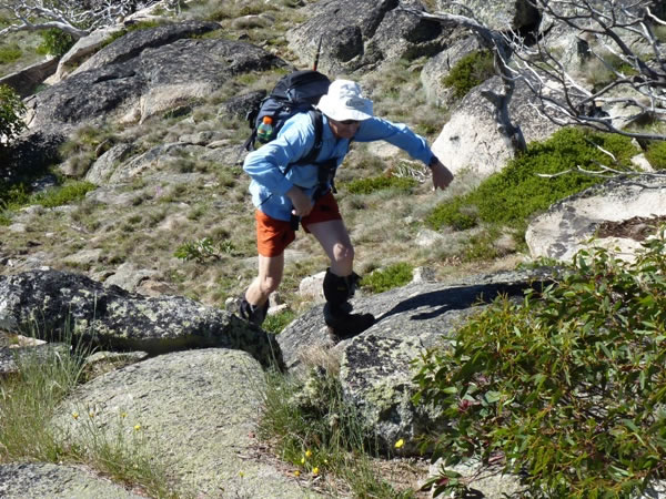 Eric leaping across rocks as he runs to the top Bimberi Peak!