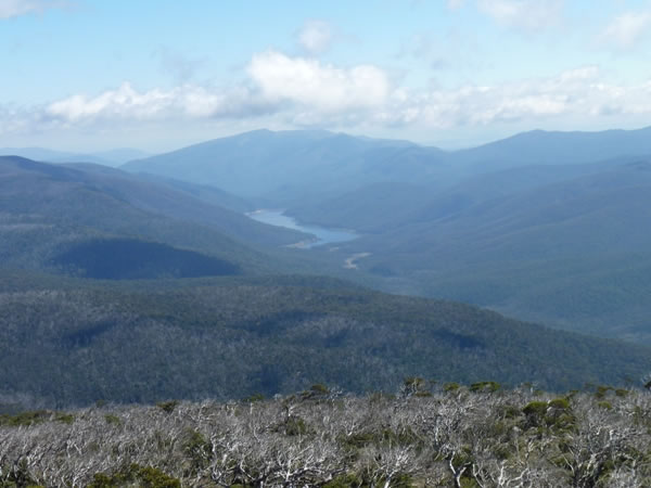 Looking nor-nor-east from the summit of Bimberi Peak across the Cotter catchment area and down onto the Corin Dam, one of Canberra's main water supply reservoirs.