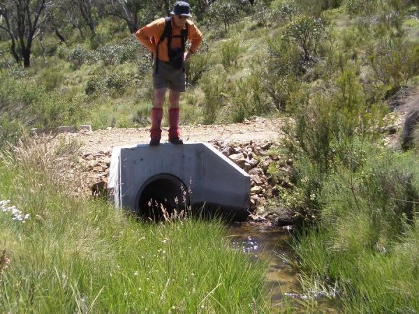 Not far from Oldfields Hut, I paused to look at a stream. The newly installed culvert I'm standing on presumably keeps the type of floods at bay that Eric and I had read about, with accounts of Bimberi climbers sometimes wading through chest-high water at this spot. |