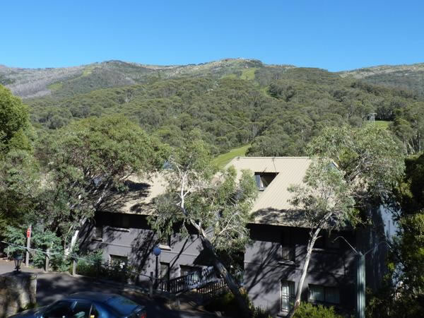 The view from our bedroom window in Bernti's, looking across the valley and up at the Kosciuszko chairlift terminal on the skyline in the centre of the picture.