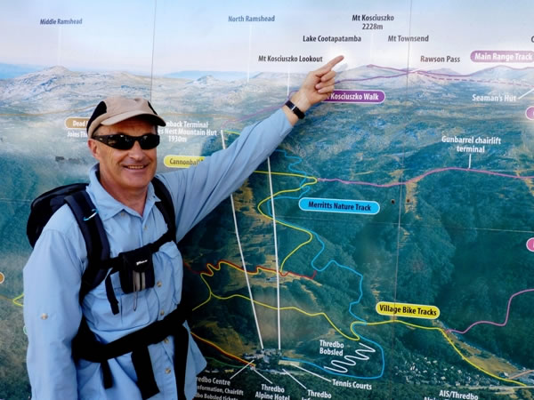 We left our hotel at 9:15 am on Monday, 4 January 2010, and went to the Thredbo Information Centre, where Eric pointed out our goal for the day – the 2,228 metre / 7,309 foot high summit of Mt Kosciuszko. Our route to the top of Mt Kosciuszko was simple: from the Information Centre we hiked up Merritts Nature Track for 5 kms to the Kosciuszko express chairlift terminal, and then trekked north-west for 6.5 kms along the Kosciuszko Walk to reach the summit of the mountain. We returned via the same route (making the day's hike a total of about 23 kms or 14.25 miles). |