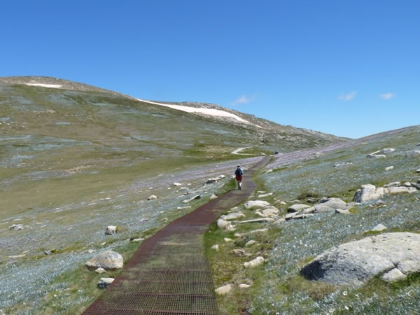 Flanked by fields of wild flowers, Eric nears Rawson Pass.