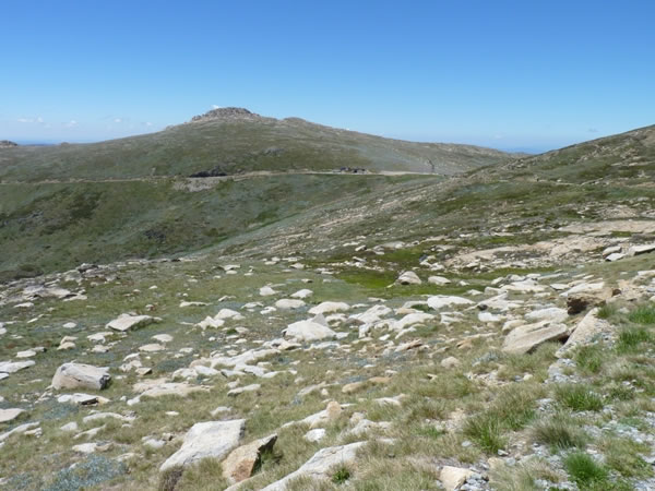 Looking back down at Rawson Pass (two-thirds the way up in the middle of the picture) and the Summit Trail track to Charlotte Pass, which heads away to the left from Rawson Pass.