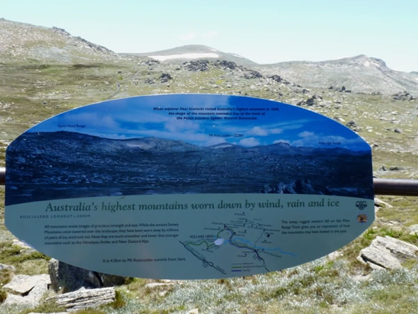 On the way back down the mountain, I took a small detour in order to have a look at the view from the Kosciuszko Lookout. This picture shows an interpretative sign containing a photograph of Mt Kosciuszko with Mt Kosciuszko above it. (Note the remarkably similar snow conditions on the sign's photo and on the mountain.) |