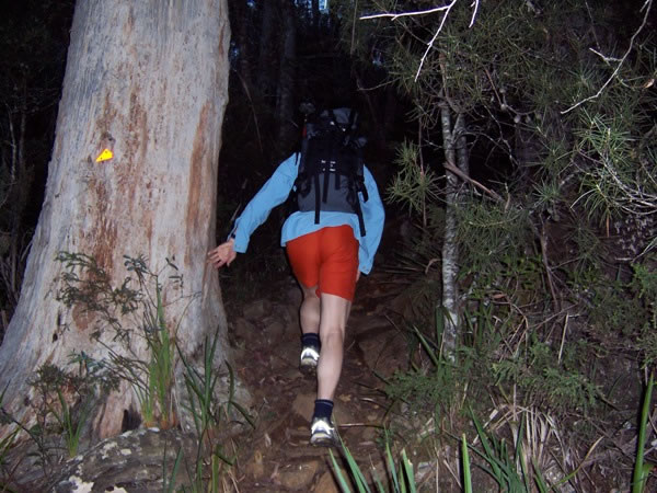 However, after twenty minutes or so, the track climbed up a steep escarpment – from a base of about 640 metres / 2,100 feet above sea-level (a.s.l.) to roughly 960 metres / 3,150 feet a.s.l. – to the saddle between Mt Oakleigh (to the north) and Mt