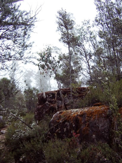Eucalyptus, tea-trees, and mossy boulders near the top of the mist-covered escarpment.