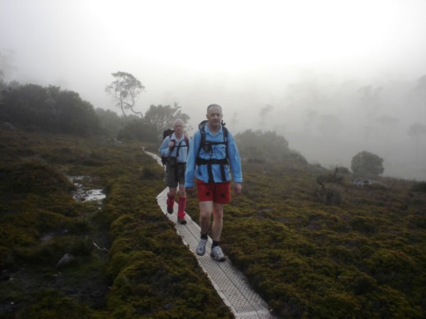 Eric and me on the boardwalks in a light mist. As this picture shows, we were now walking downhill – but so gently that we gave little thought to the fact that we would be walking uphill at the end of the day! (Photo: Ralph Baulis)