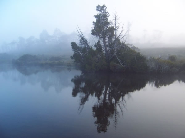 Pencil pines and a small unnamed lake on the northern side of the track.