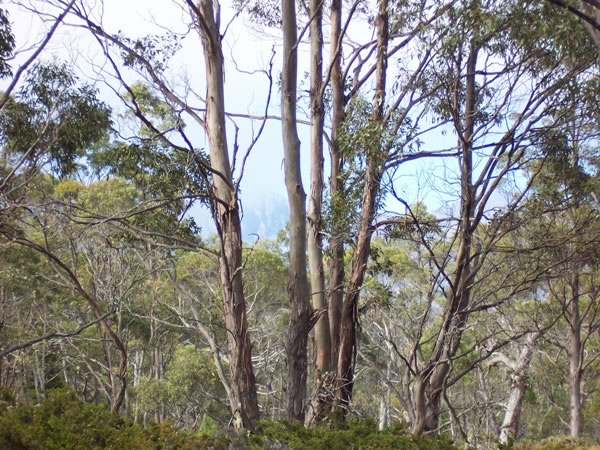 Looking south-south-west from the Innes Track, after nearly three hours' walking we could just begin to see Mt Ossa through the lifting clouds.