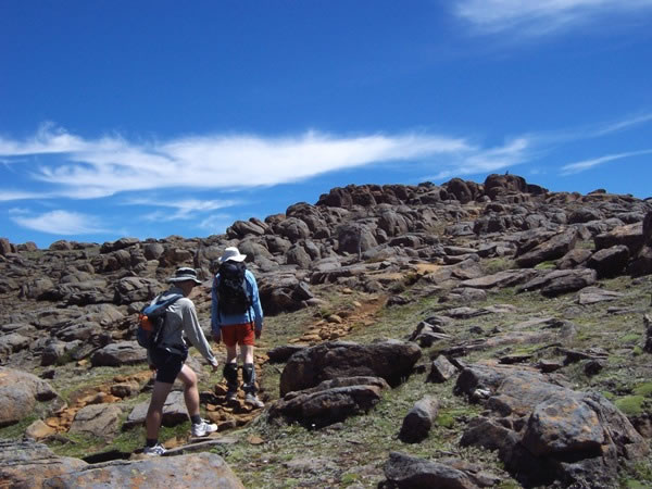 Ralph and Eric make their way across the summit plateau towards the pinnacle of Mt Ossa.