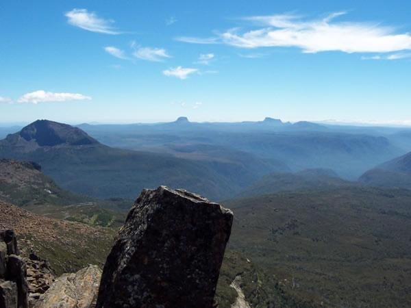 A view from the summit of Mt Ossa (1,617 metres / 5,305 feet) of (from left to right) Mt Pelion West (1,560 metres / 5,118 feet), Barn Bluff (1,559 metres / 5,114 feet), and Cradle Mountain (1,545 metres / 5,068 feet).