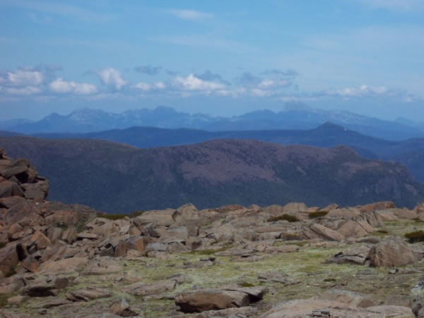 A telephoto picture looking west at Frenchman's Cap (on the horizon about a quarter the way in from the right-hand edge of the photograph).