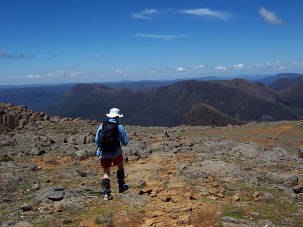 Eric and Ralph make their way down and across the summit plateau of Mt Ossa.