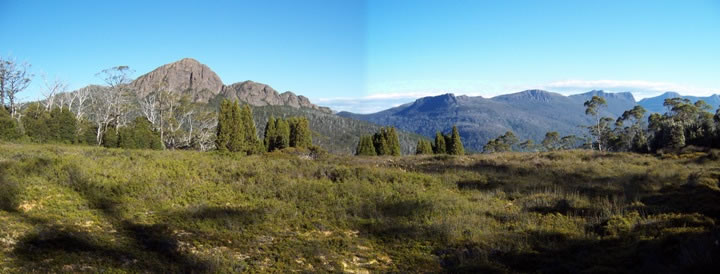 A two-shot panorama of Mt Pillinger (on the left) and (from left to right in the right-hand half of the picture) of Dean Bluff (1,398 metres / 4,586 feet), Bishop Peak, and Cathedral Mountain (1,378 metres / 4,521 feet).
