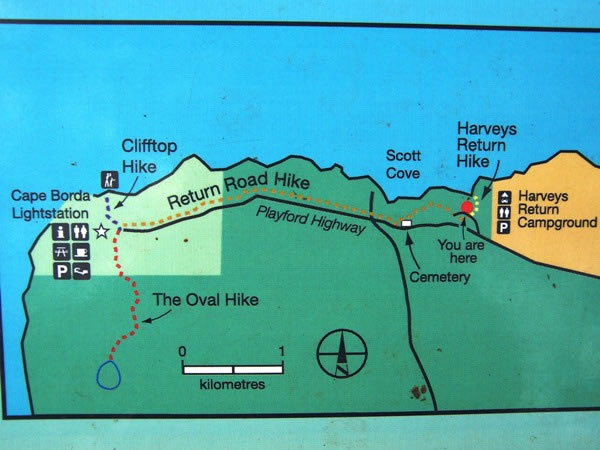 HIKING: Our second walk was the next day (i.e., on Saturday, 18 October). It was along the Return Road track from the Cape Borda lighthouse to the cove at Harvey's Return, and back; and was only about 9 kilometres.