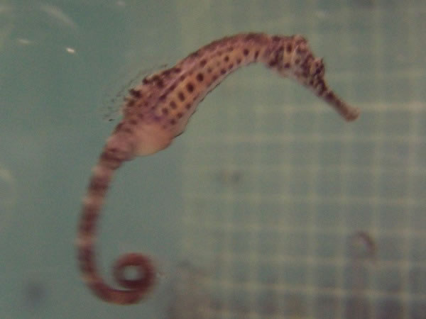 A seahorse using its delicate dorsal fin to propel itself through the nursery tank in which it's swimming.